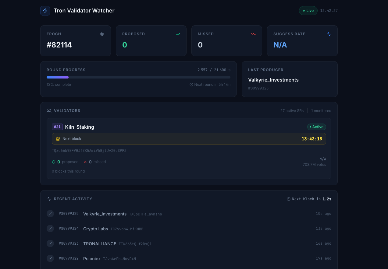 While the Tron network provides robust explorers, professional operators often require more granular, real-time insights into their specific performance and "missed block" metrics. This is where the Kiln Tron Validator Watcher comes in.